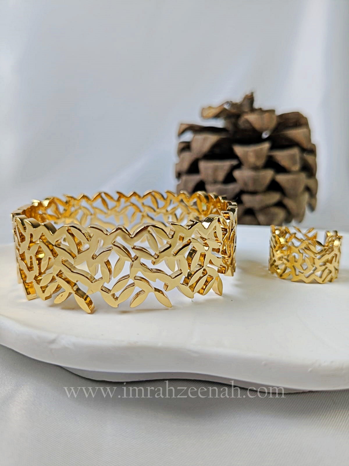 Electroplated in a micro-furnace gold plating technique, the set ensures long-lasting shine, durability, and resistance to fading. Both cuff and ring are adjustable, making them a versatile fit for any wrist and finger size.
